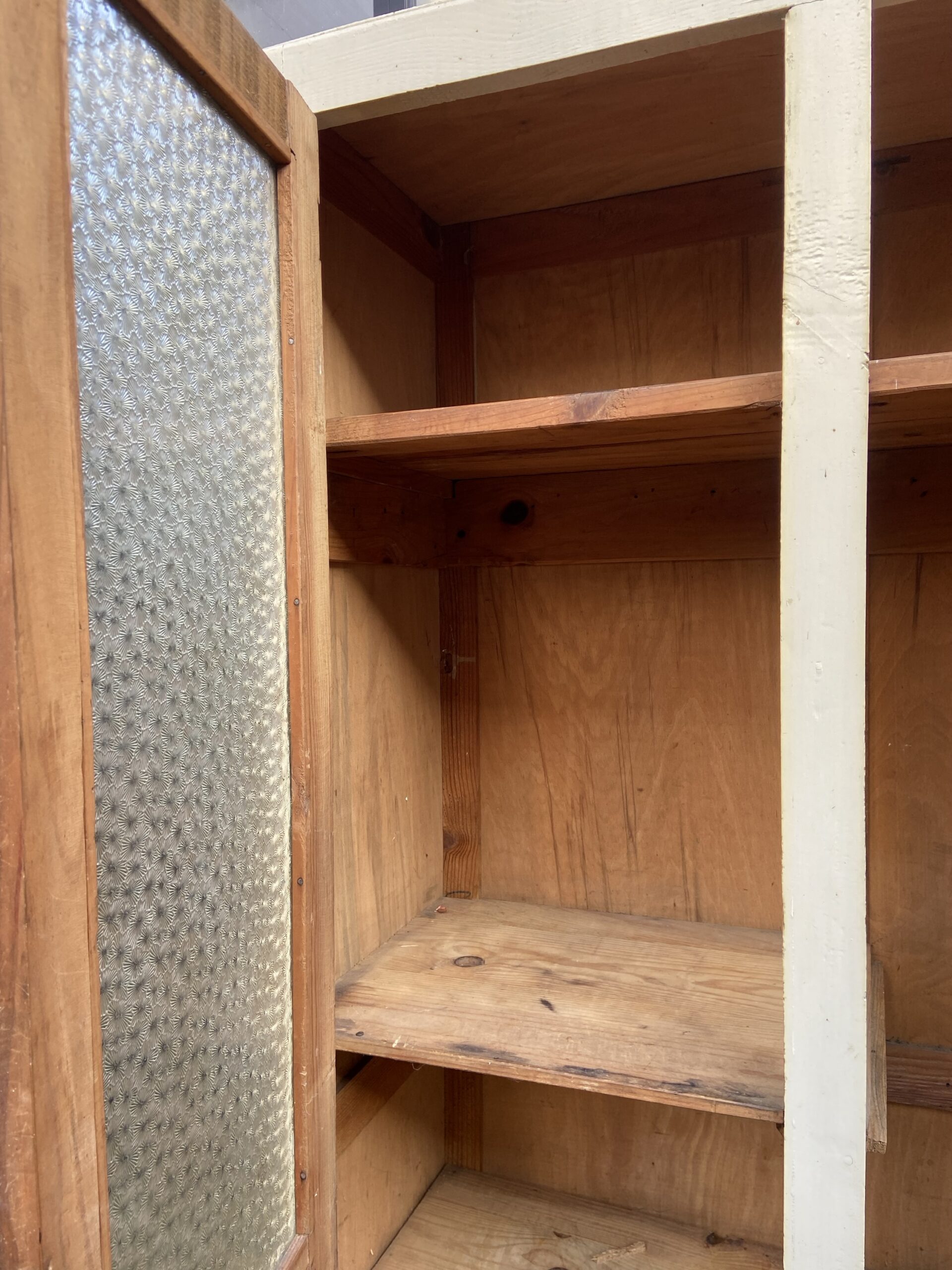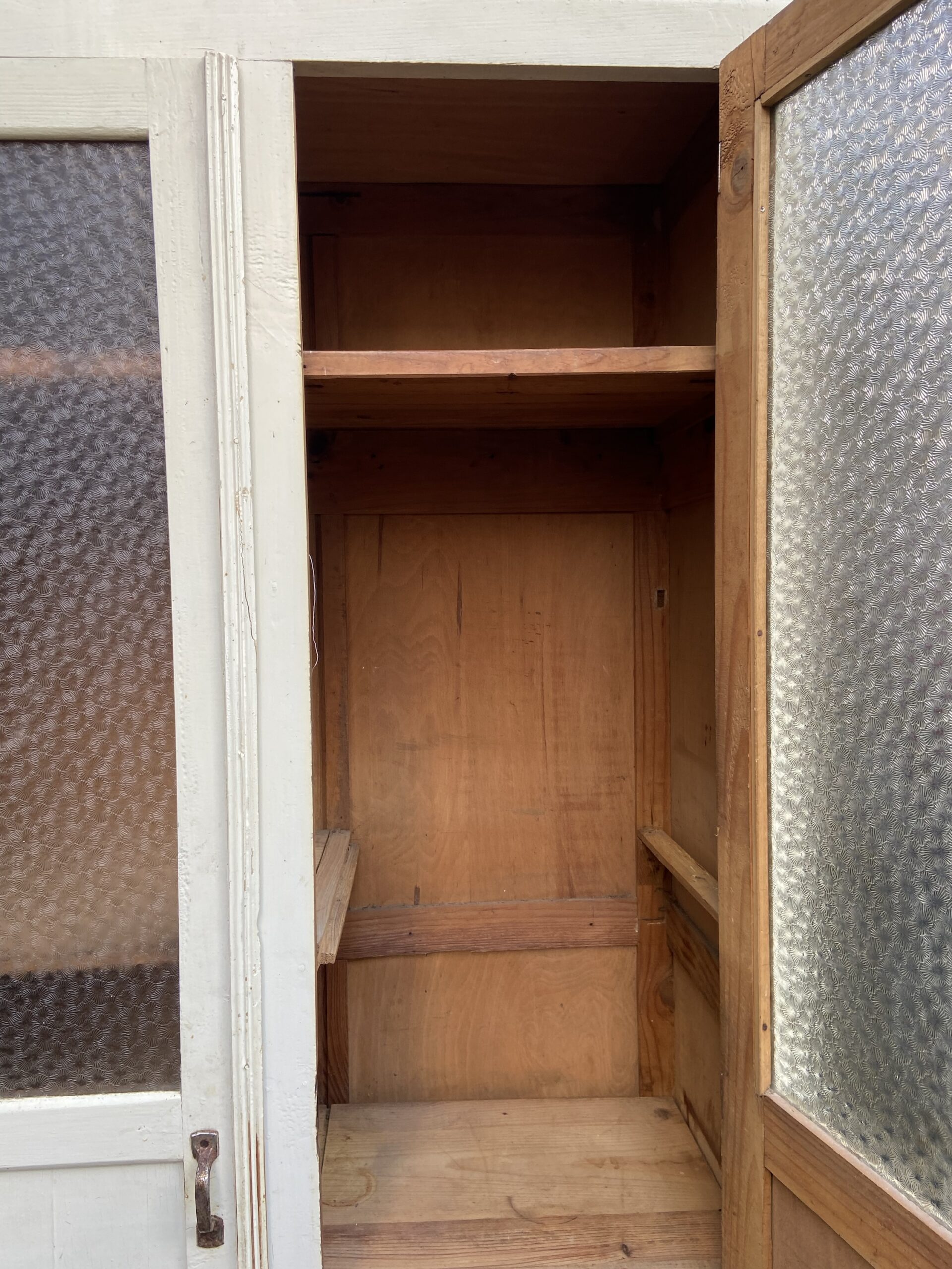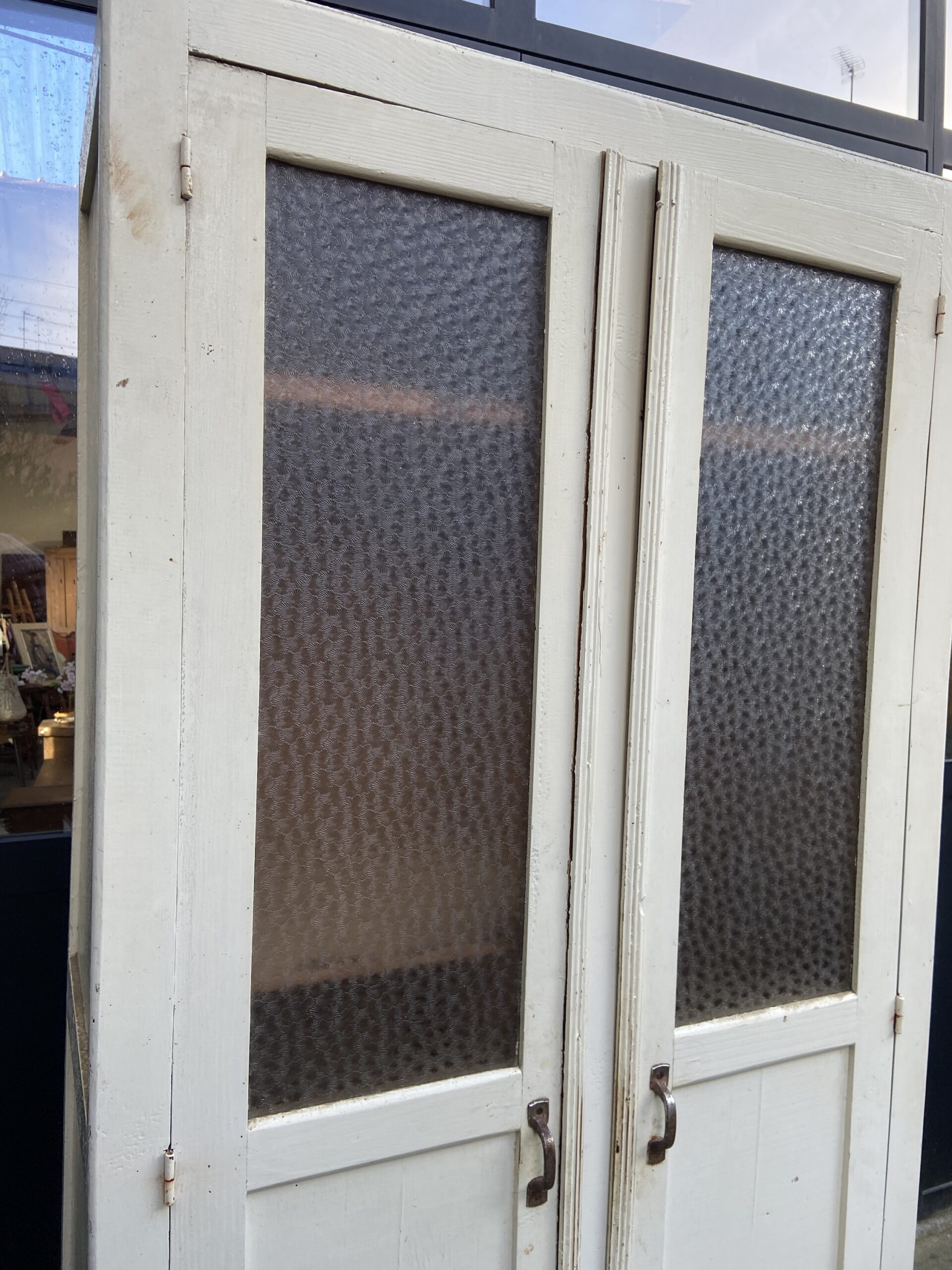 Armoire parisienne vintage. Deux portes . Partie basse pleine et partie haute vitrée. Verre cathédrale. Étagères. Patine blanche d’origine.