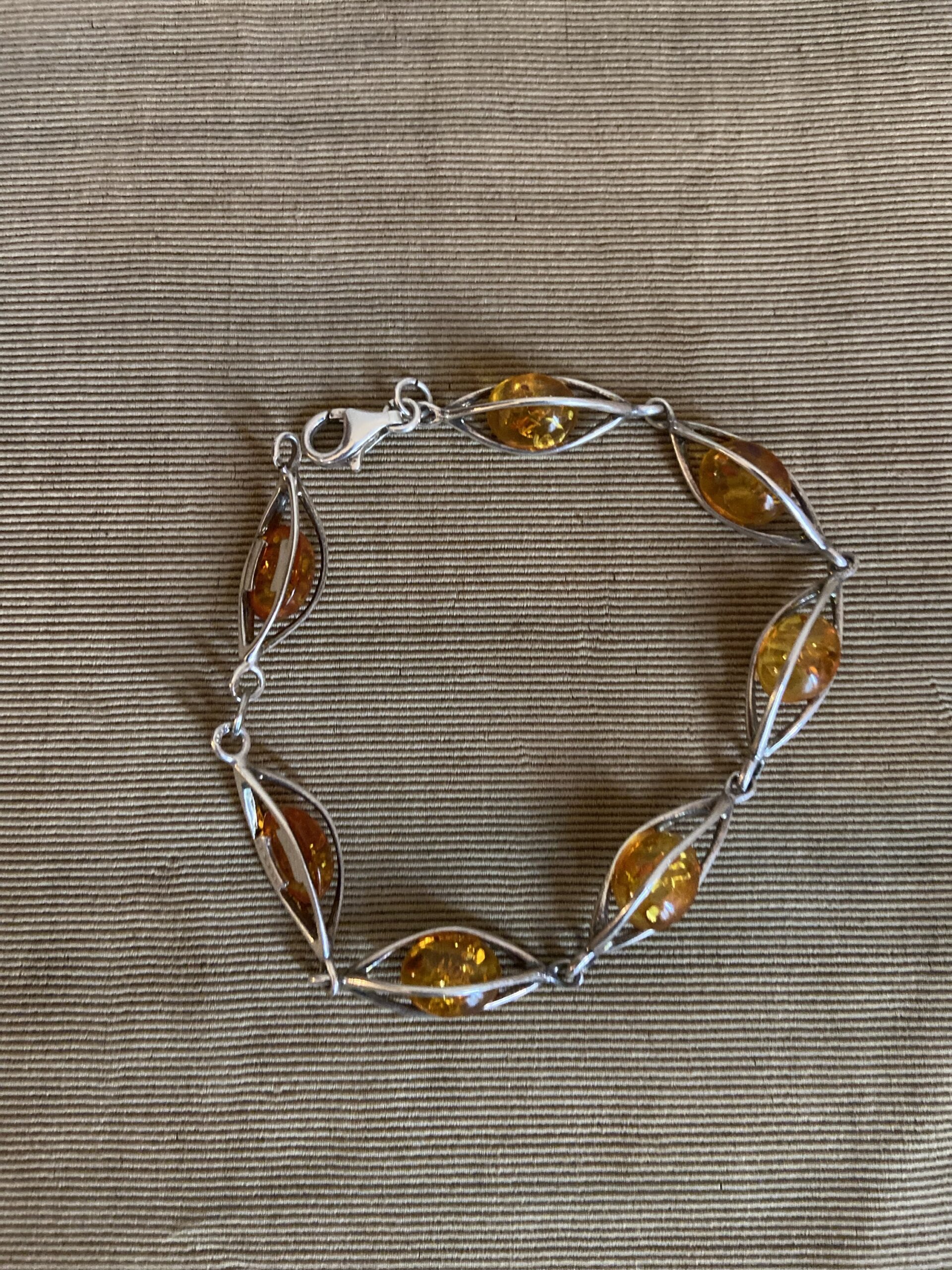 Joli bracelet en argent et ambre. Chaîne en argent et perles en ambre. Années 90.