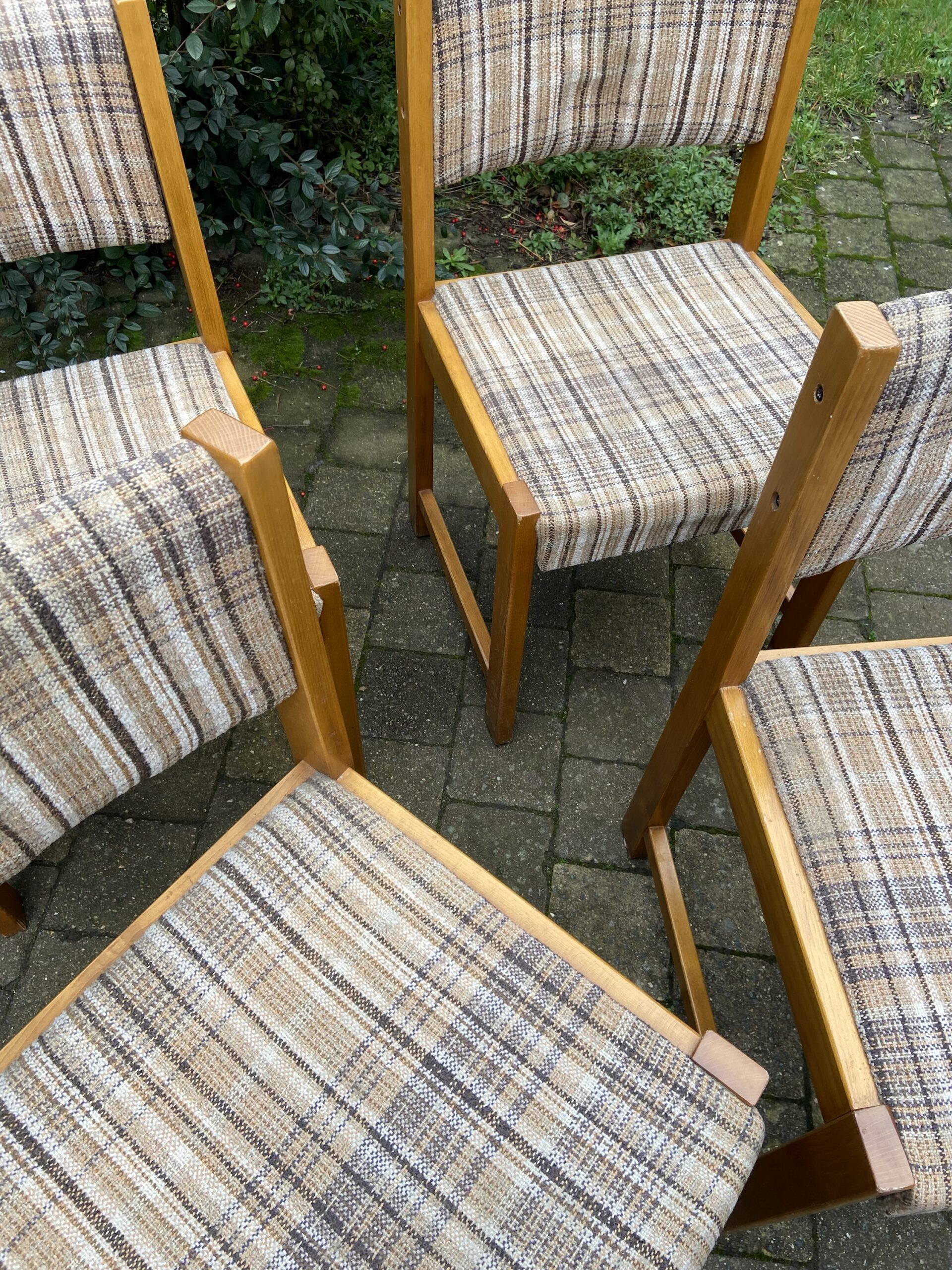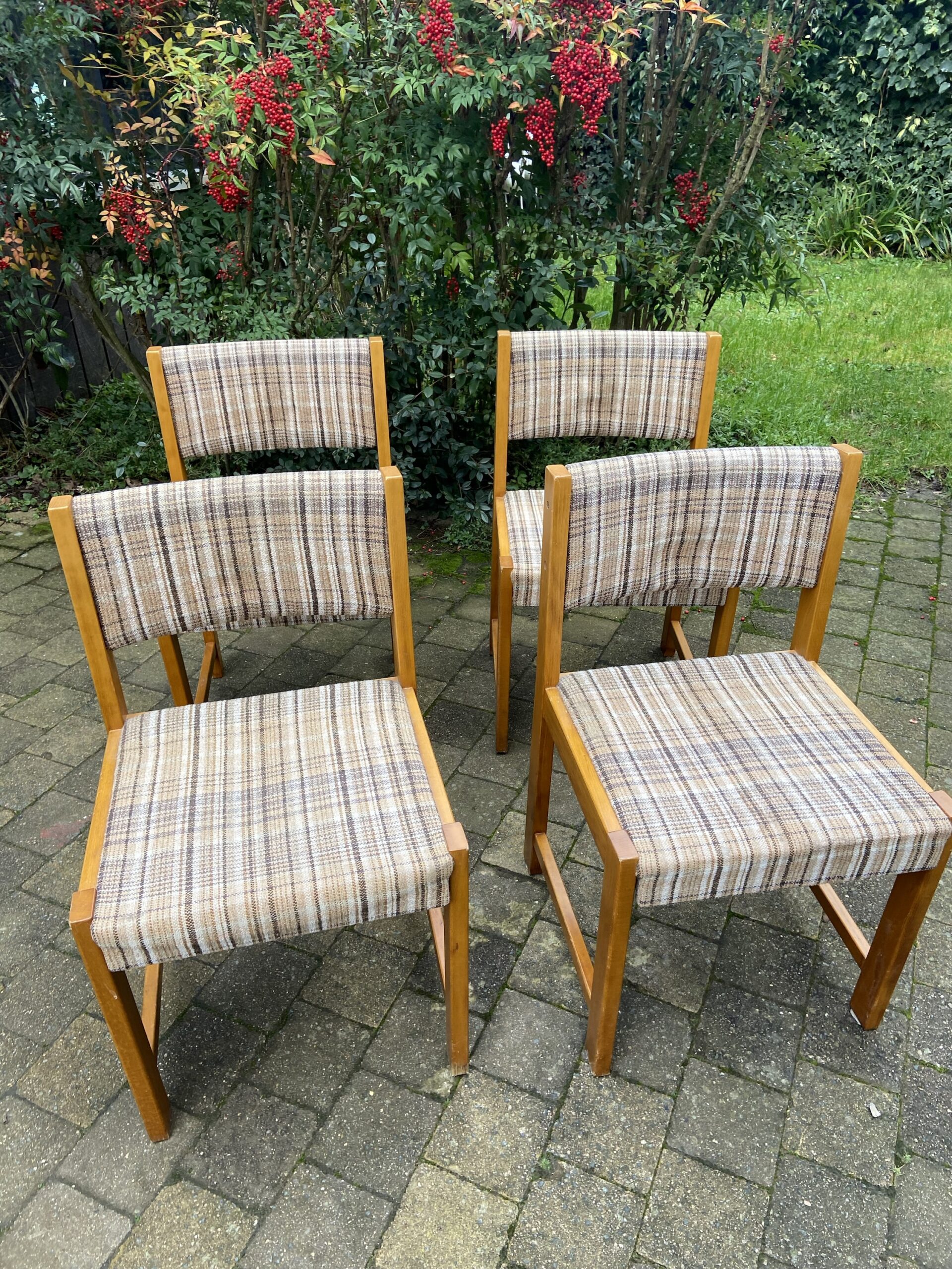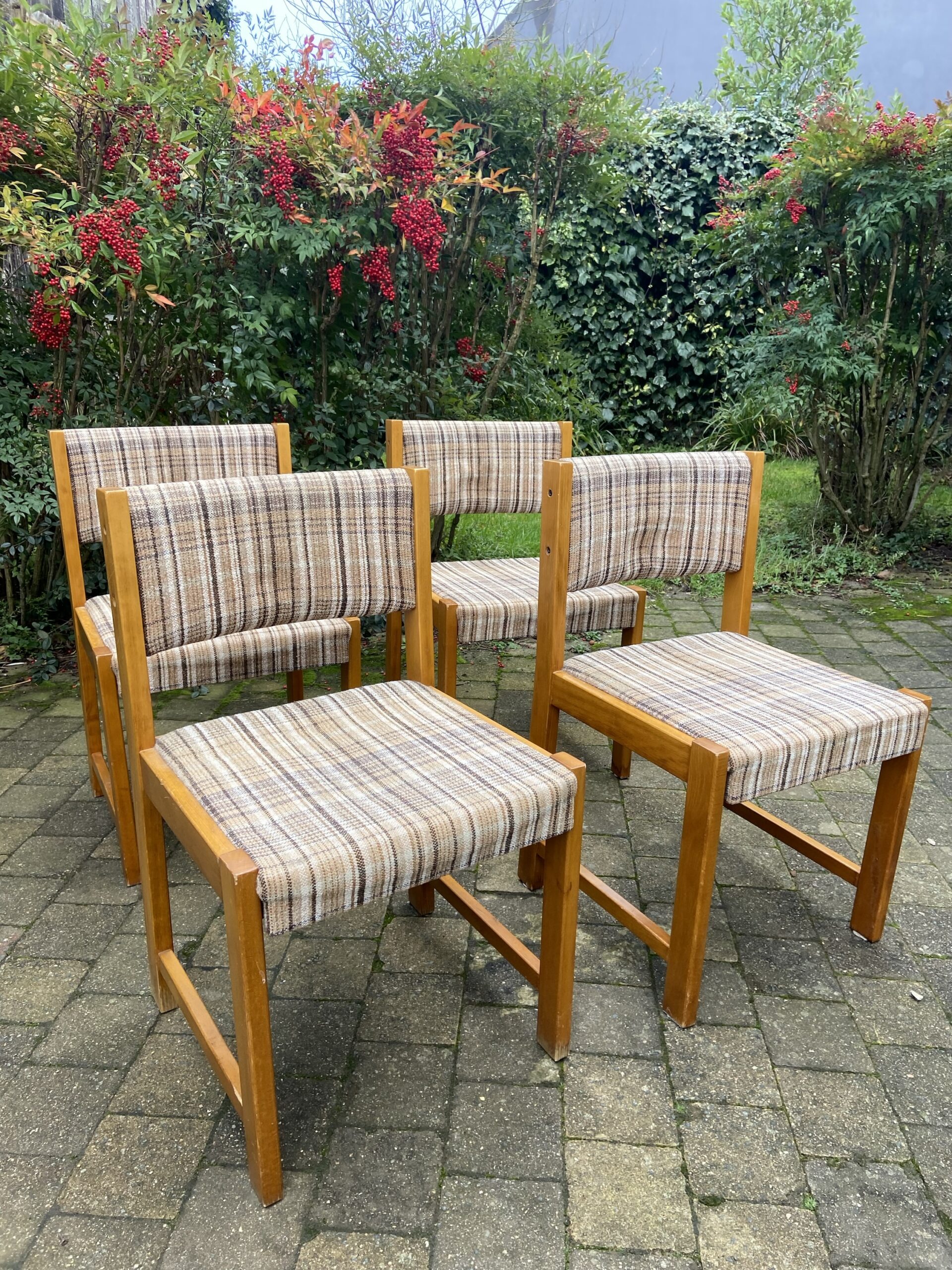 Lot de 4 chaises vintage des années 70. En bois et tissu d’origine.