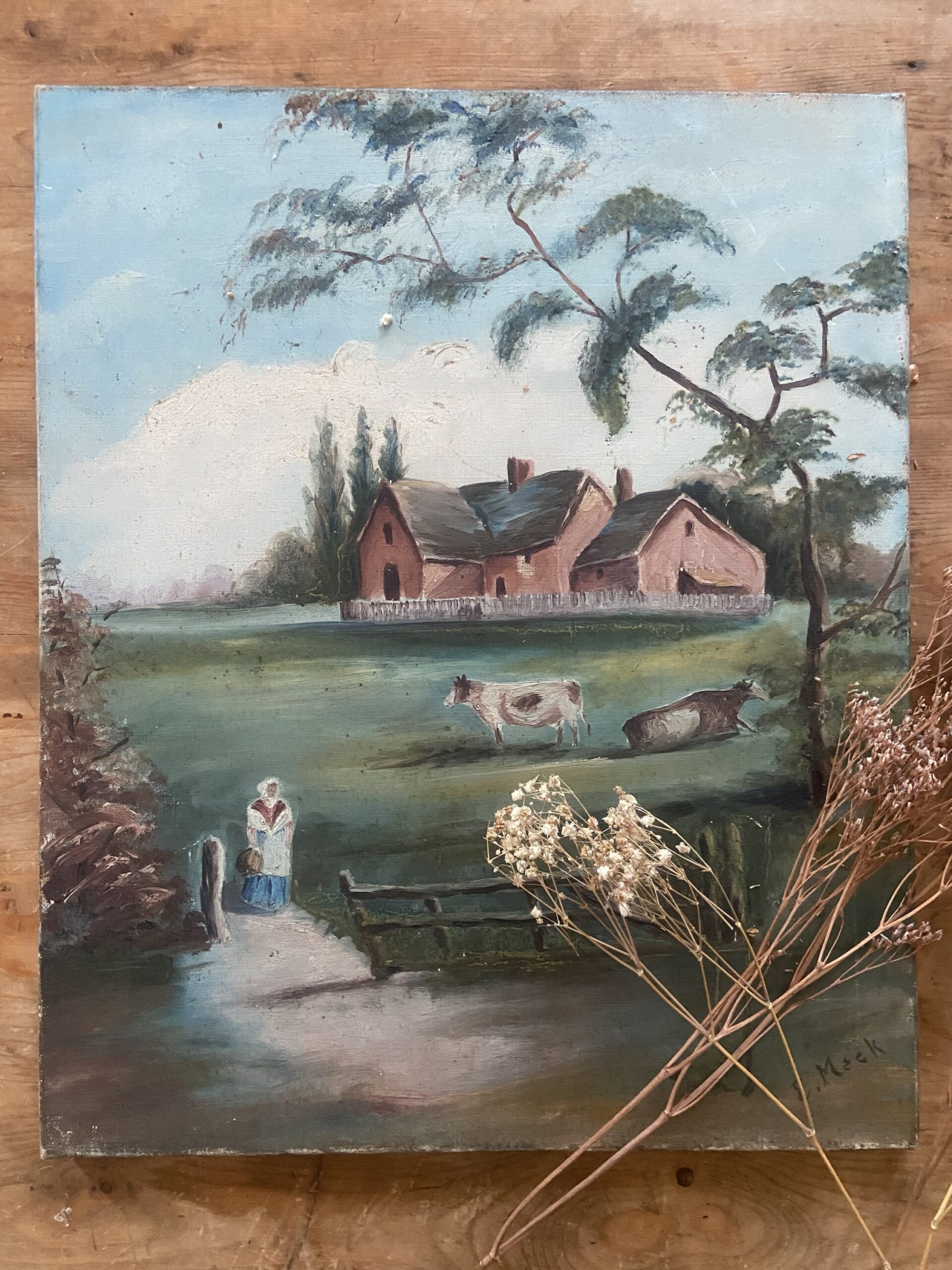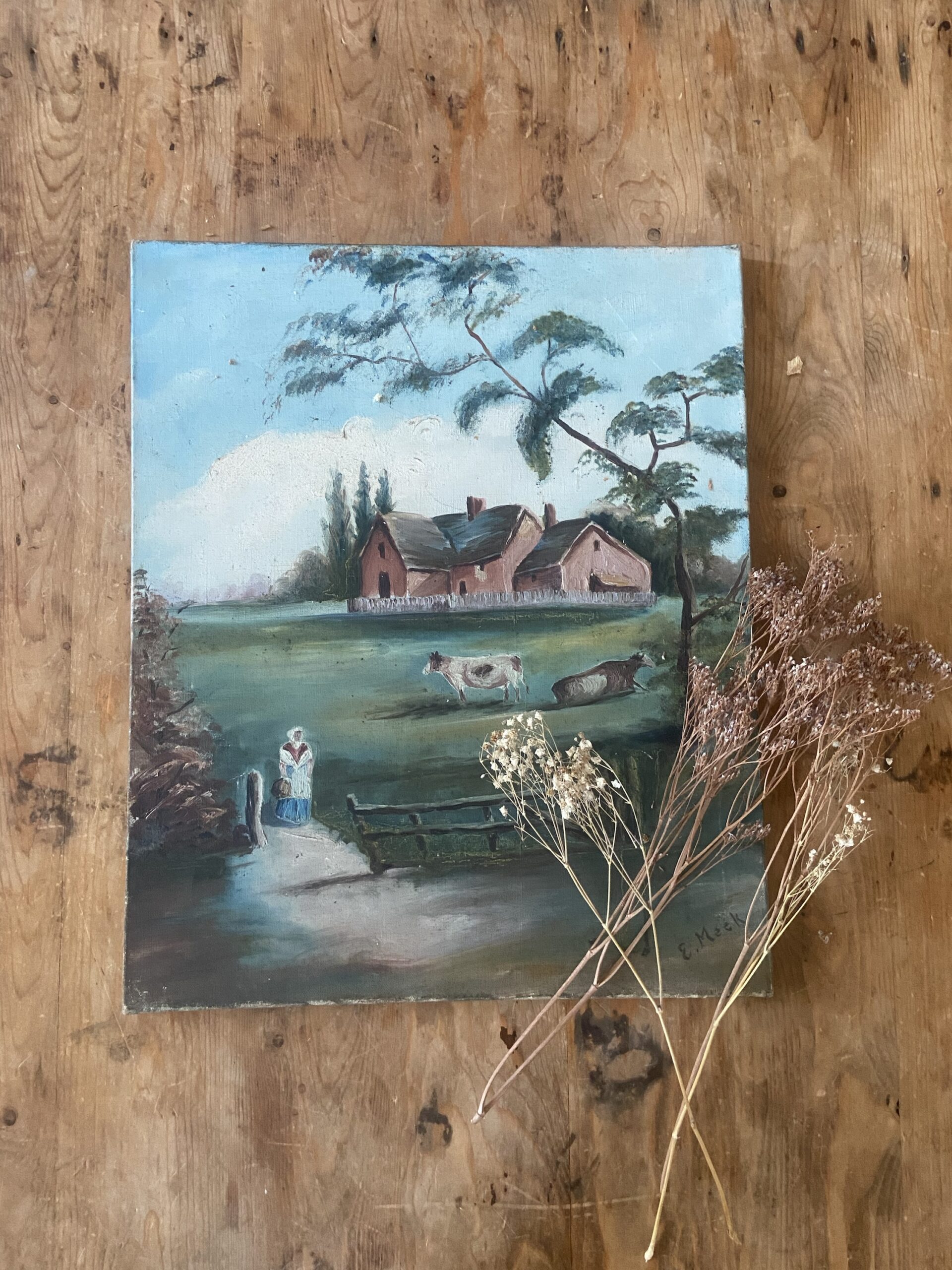 Huile sur toile représentant une petite ferme. Signée en bas à droite . Première moitié du XXème siècle .