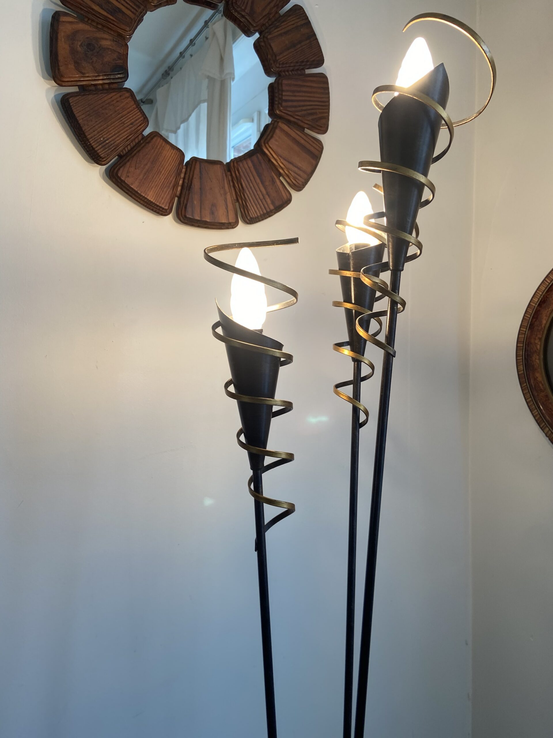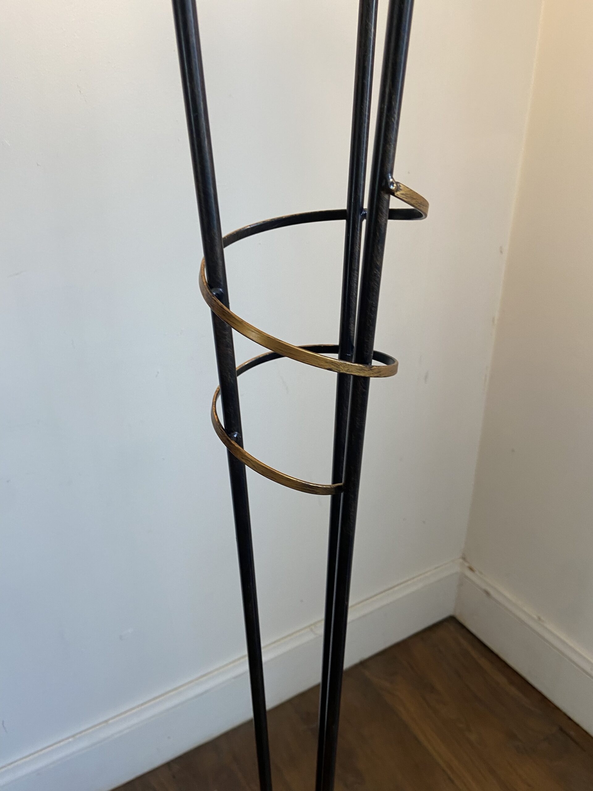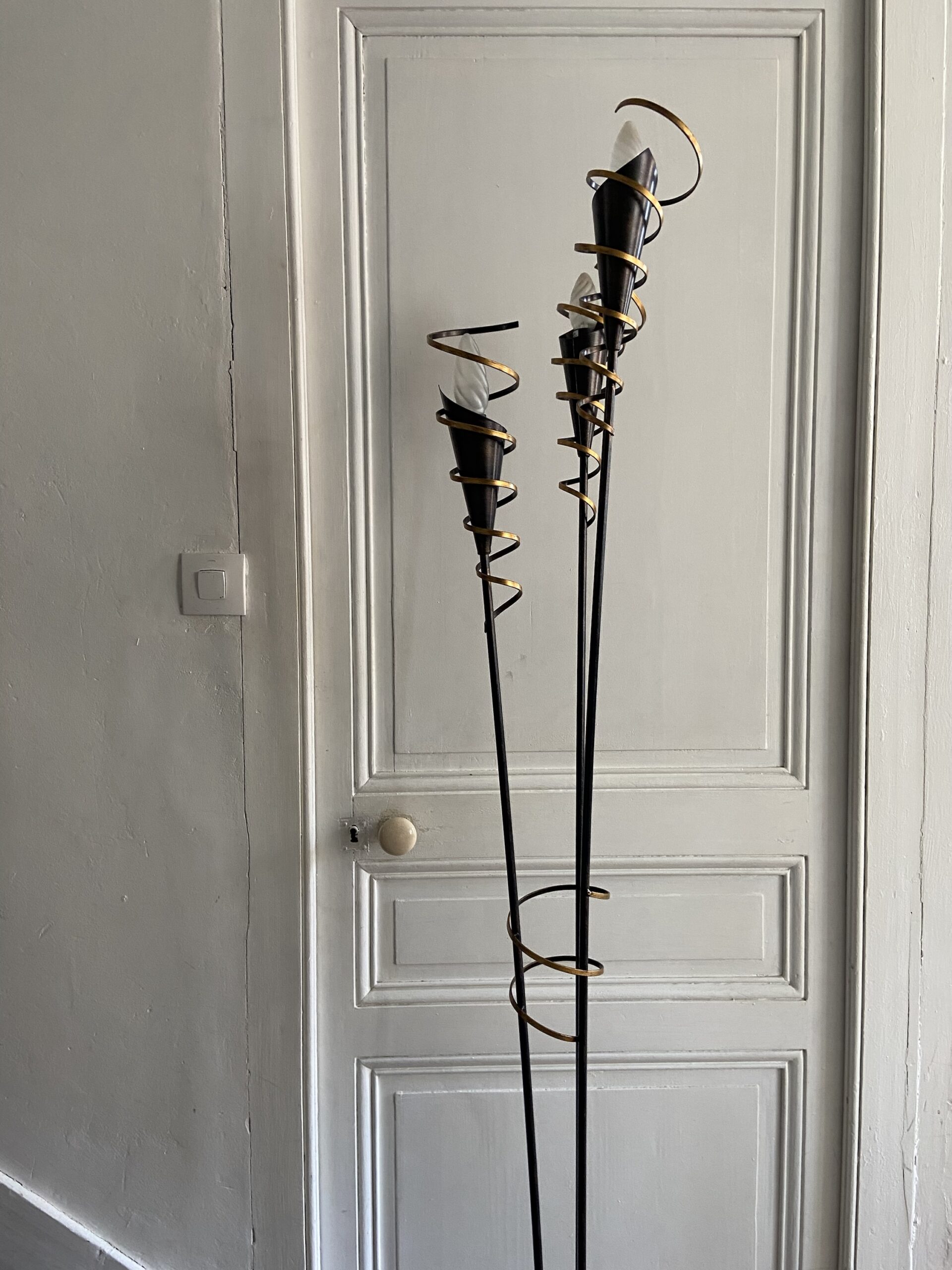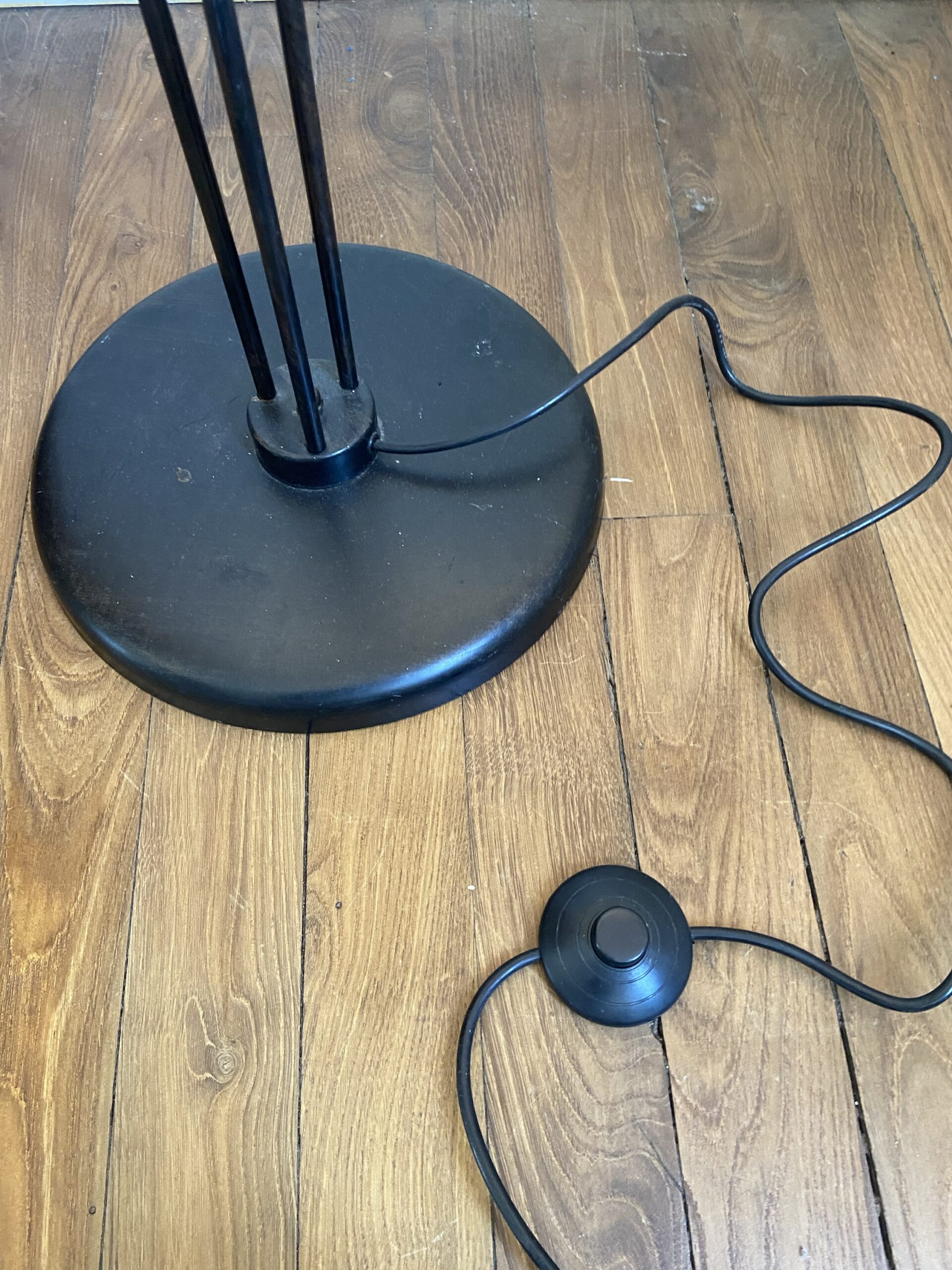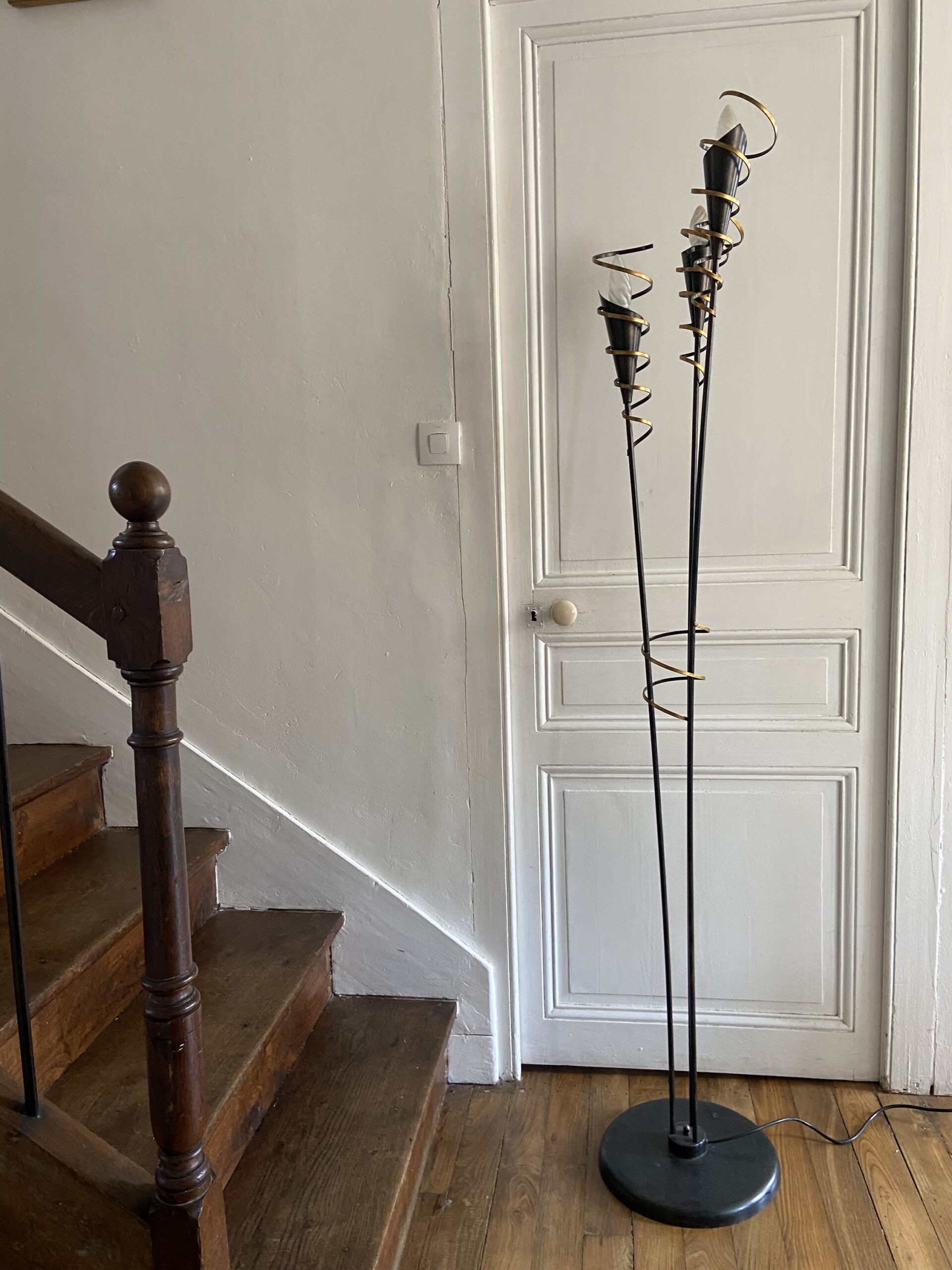 Lampadaire 3 feux en métal noir et doré. Vendu sans les opalines autour des ampoules. Années 90. De style vintage.