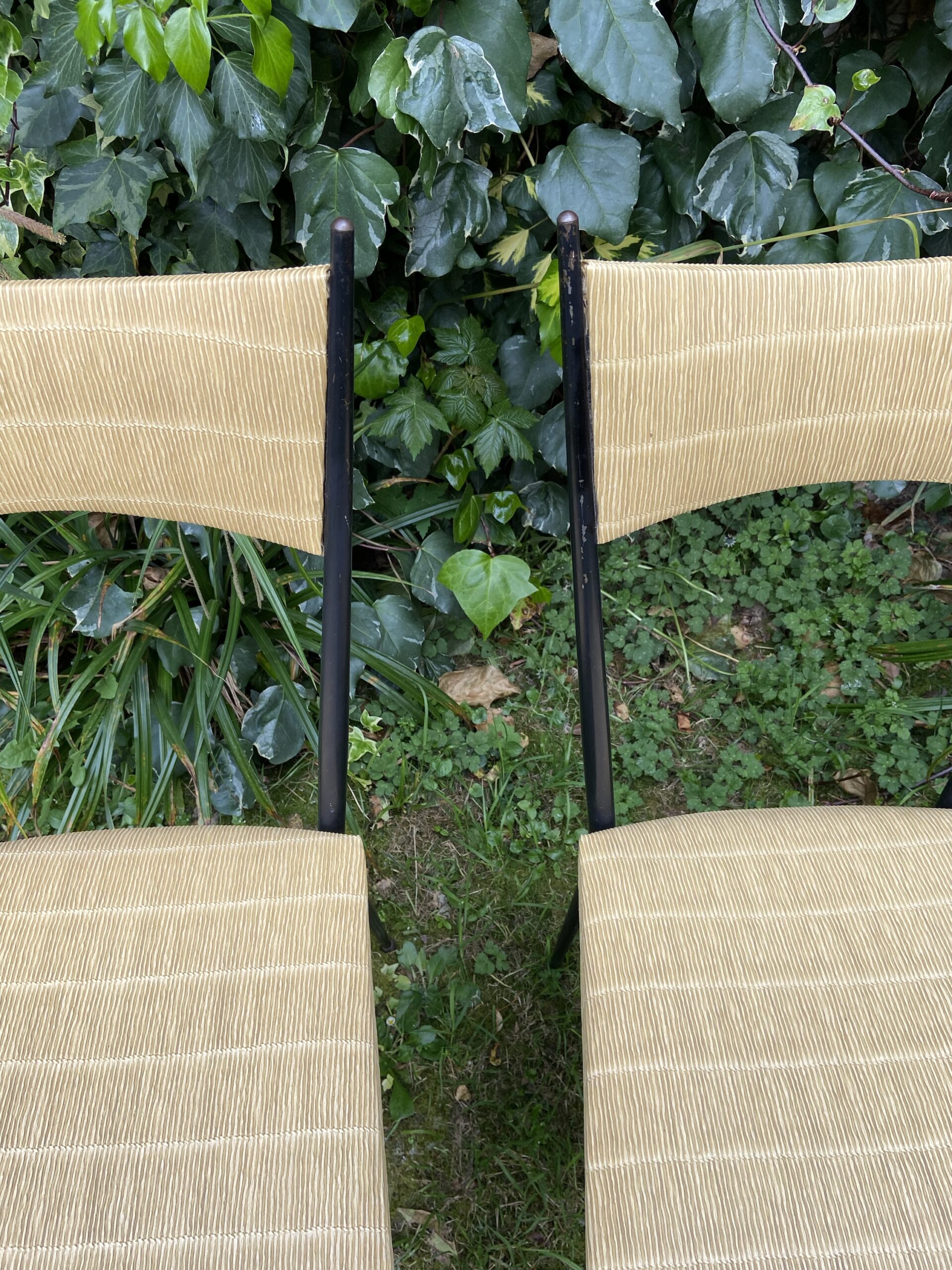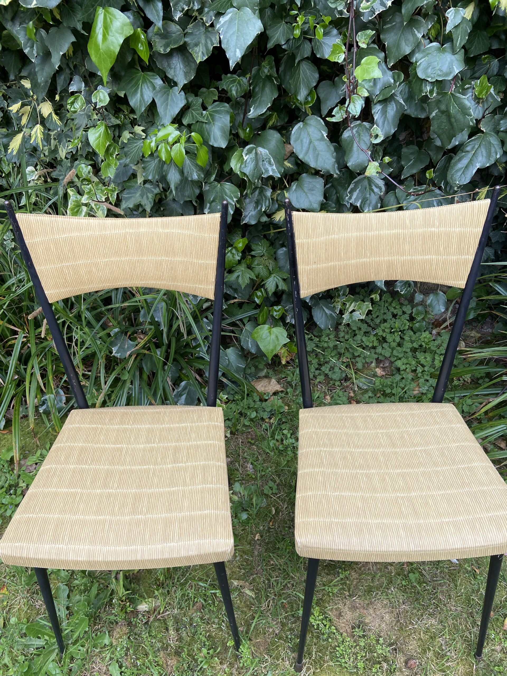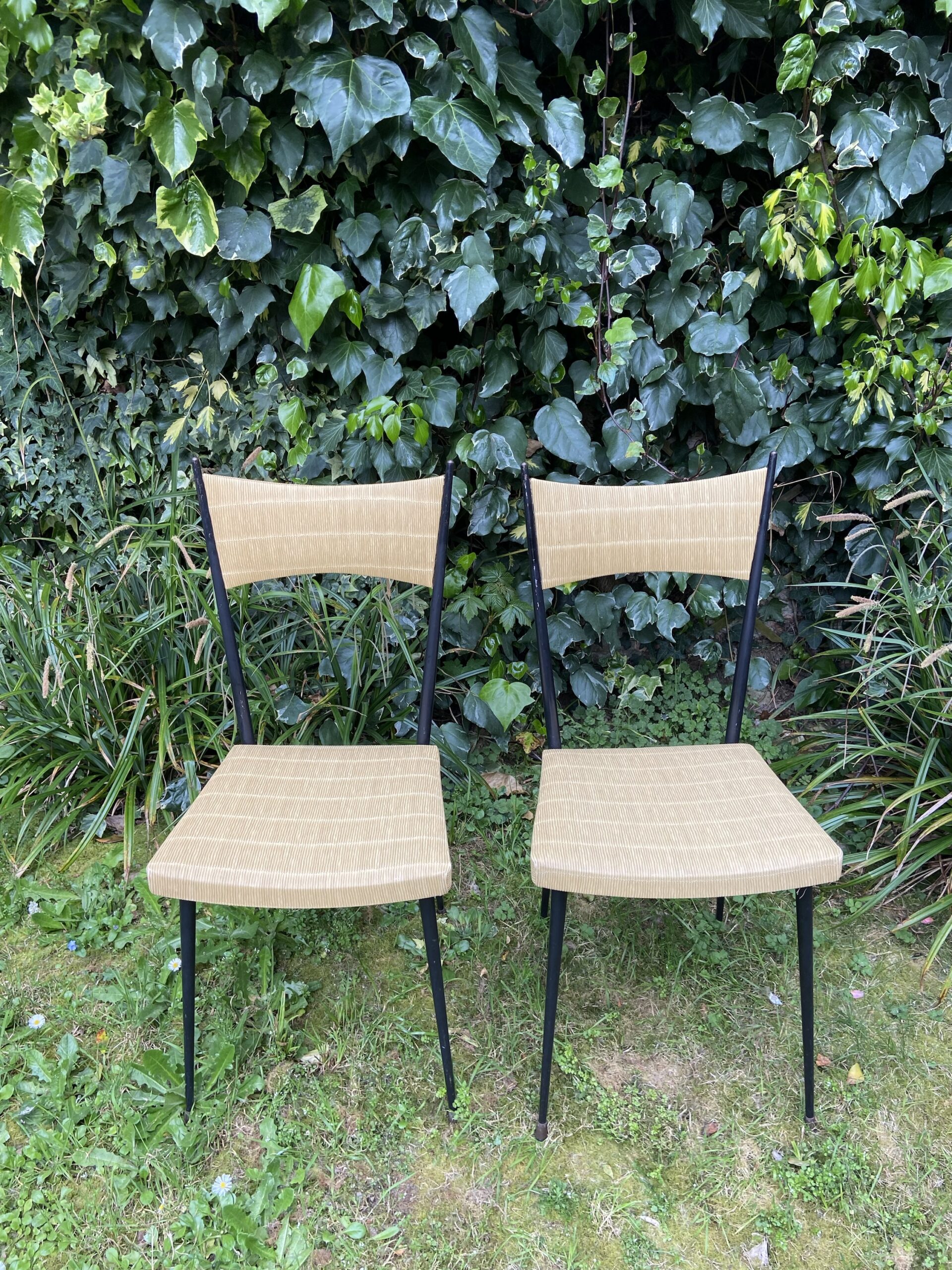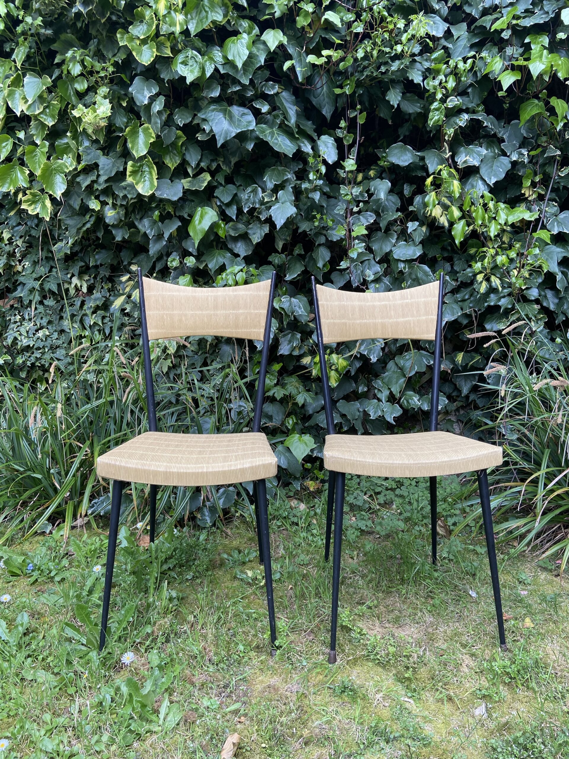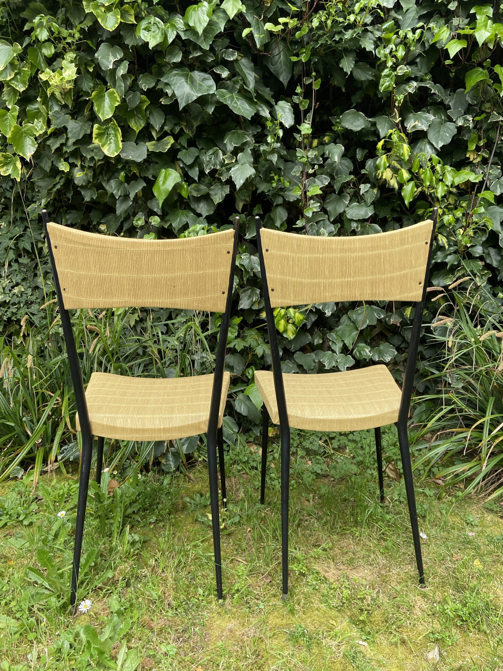 Paire de chaises vintage Colette Gueden . Années 50. Structure en metal noir. Assise et dossier en skai imitation paille.