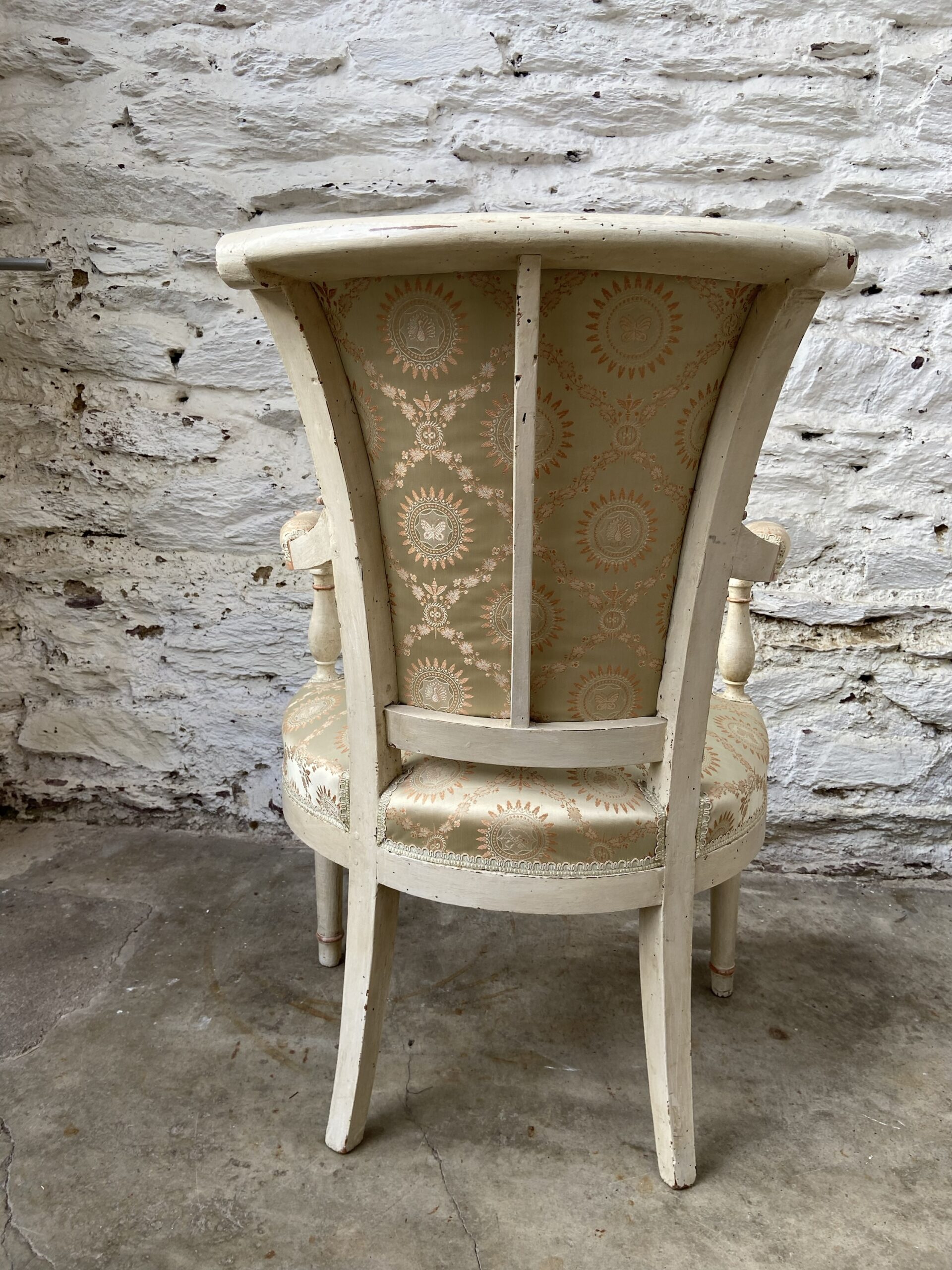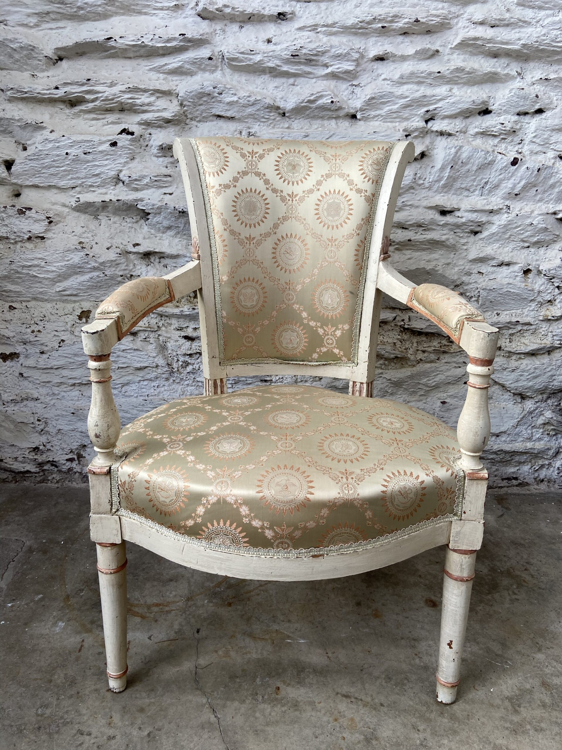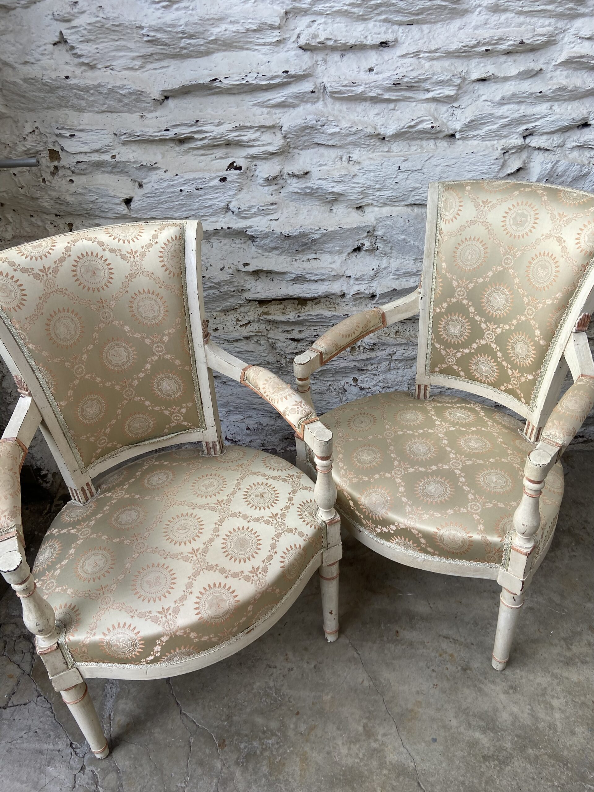 Paire d’anciens fauteuils 19eme en bois patiné. Patine blanche d’origine. Tapisserie d’origine.