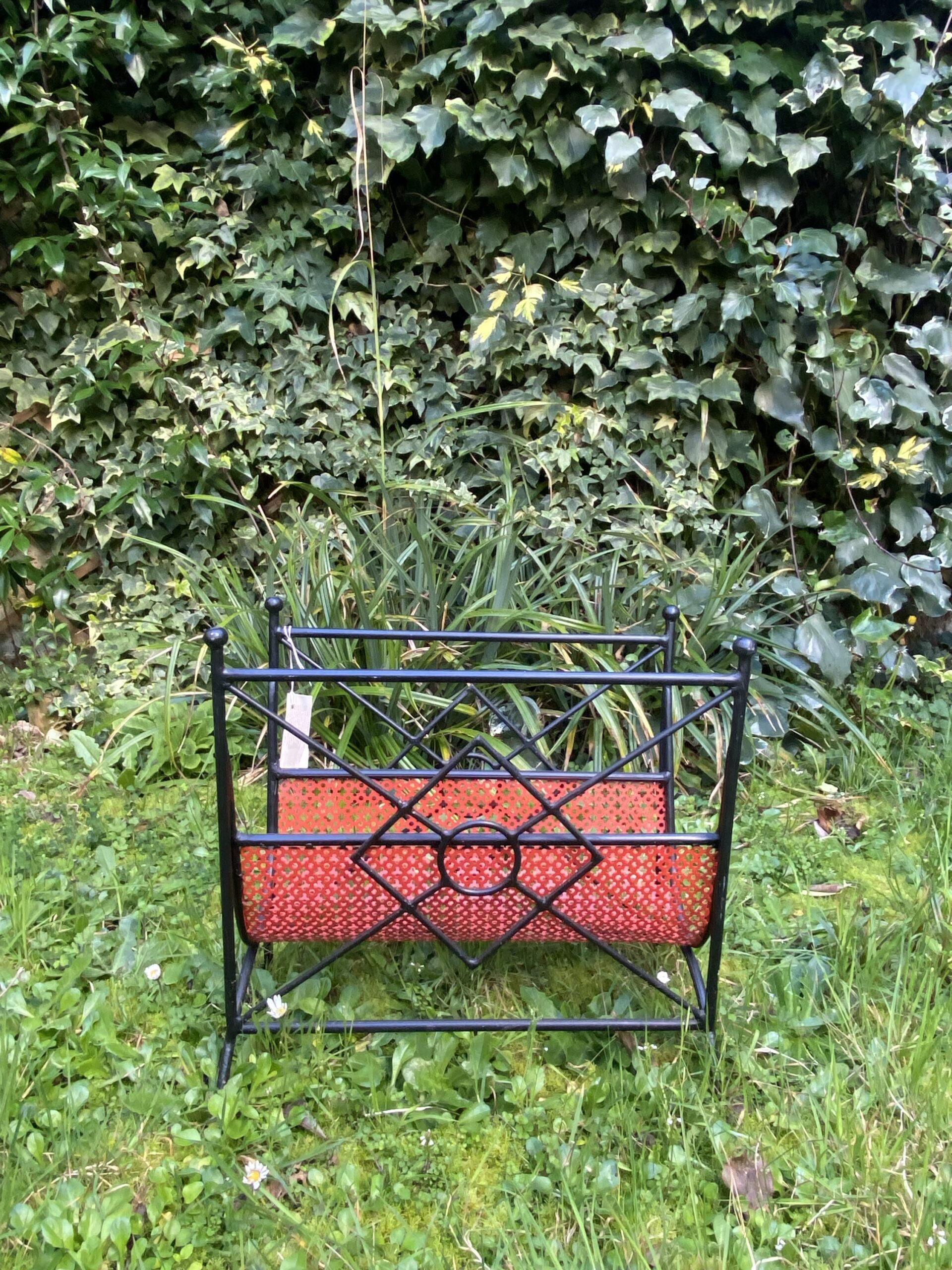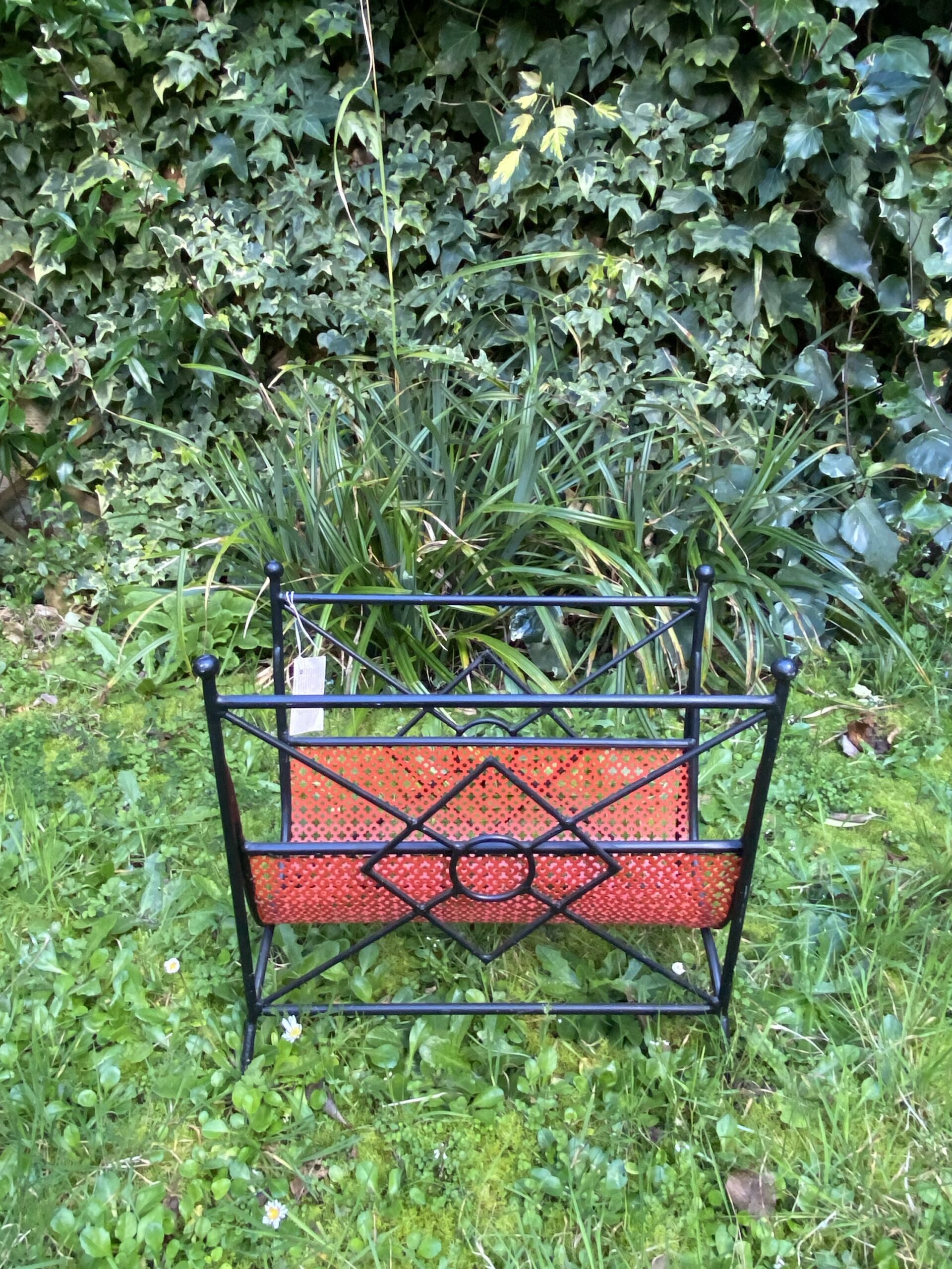 Porte revue en fer forgé noir et rouge. Années 50-60. Structure en metal noirci et partie centrale en metal perforé rouge .