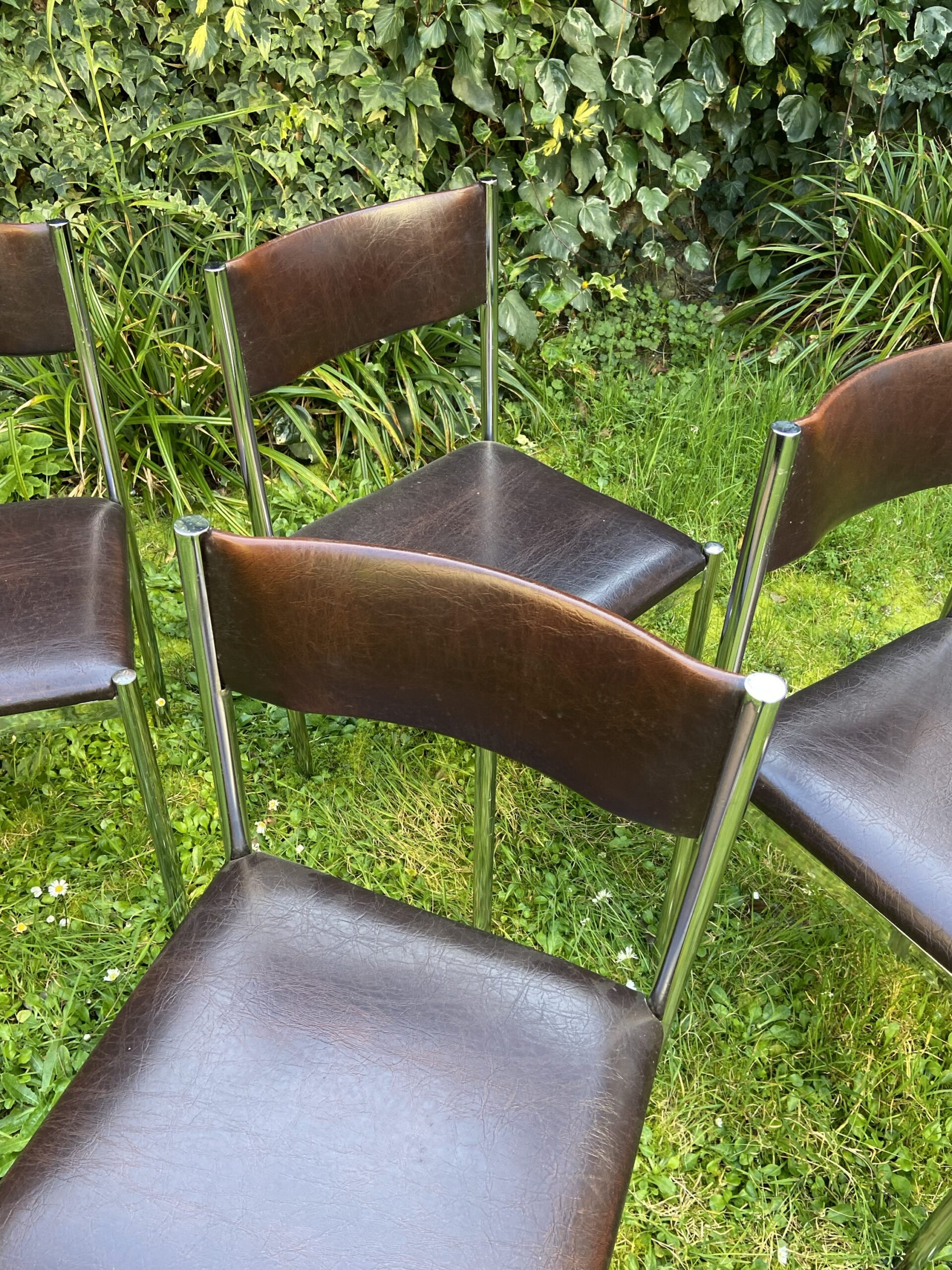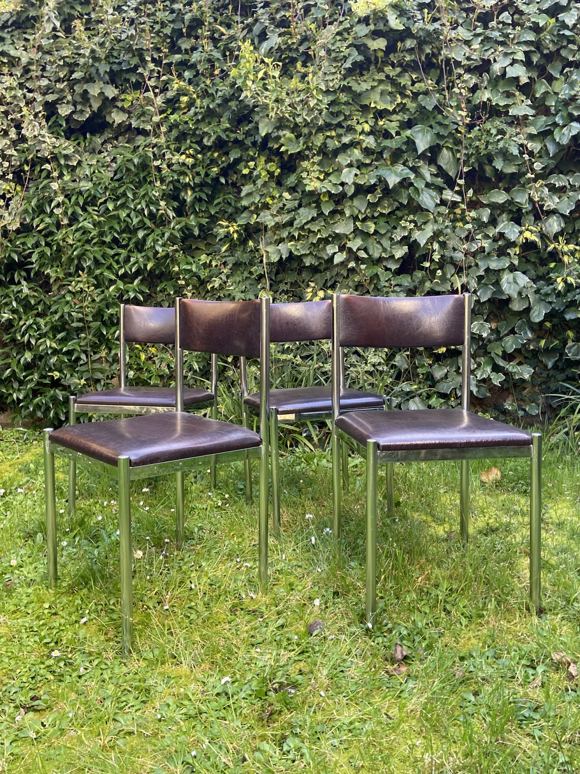 Série de 4 chaises Maison Collomb des années 70. Structure en metal chromé . Dossier et assise en cuir marron.