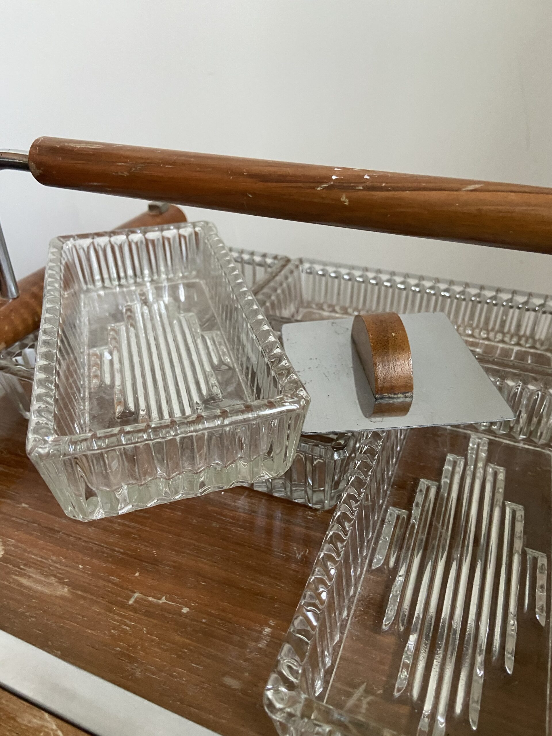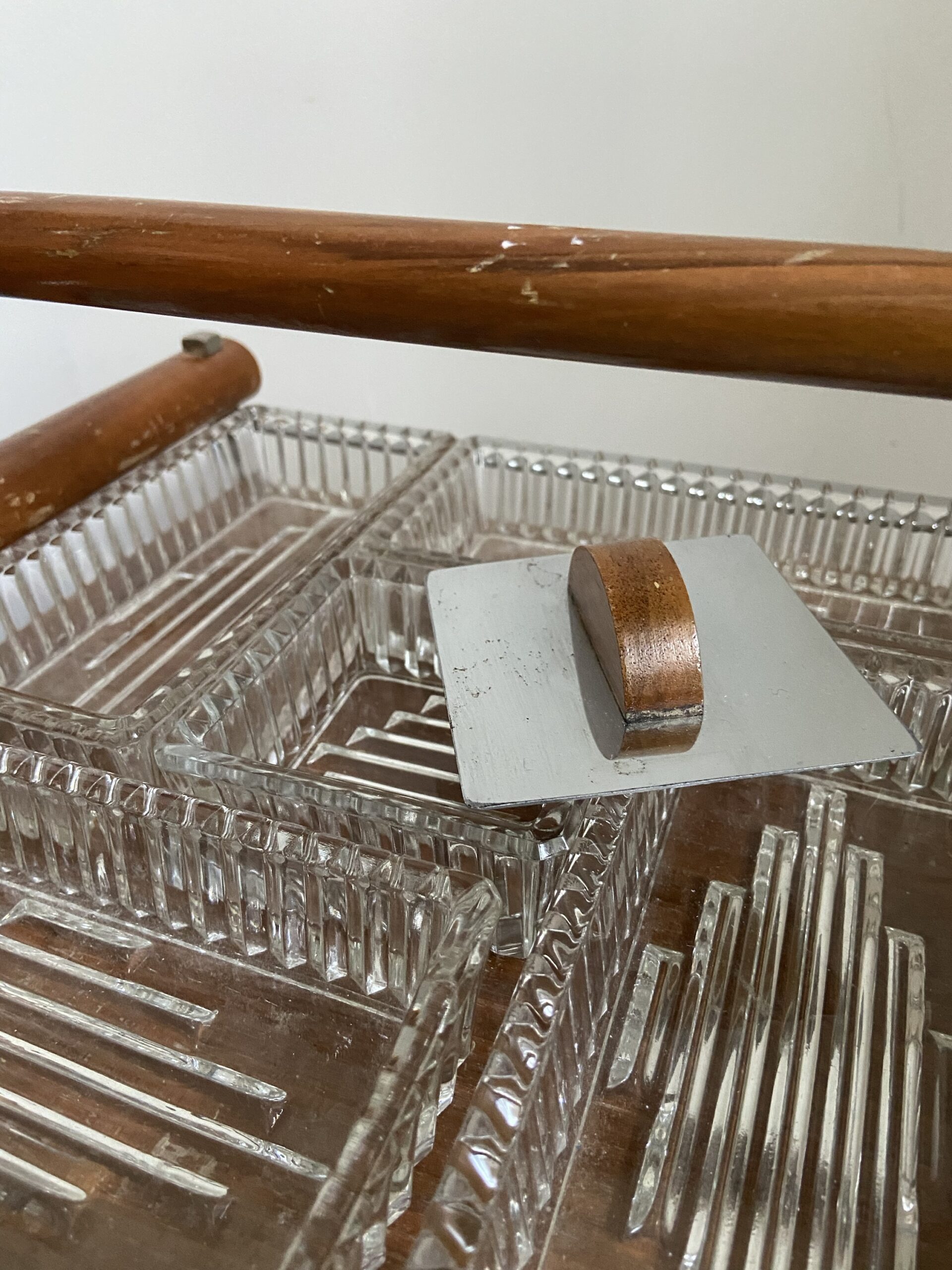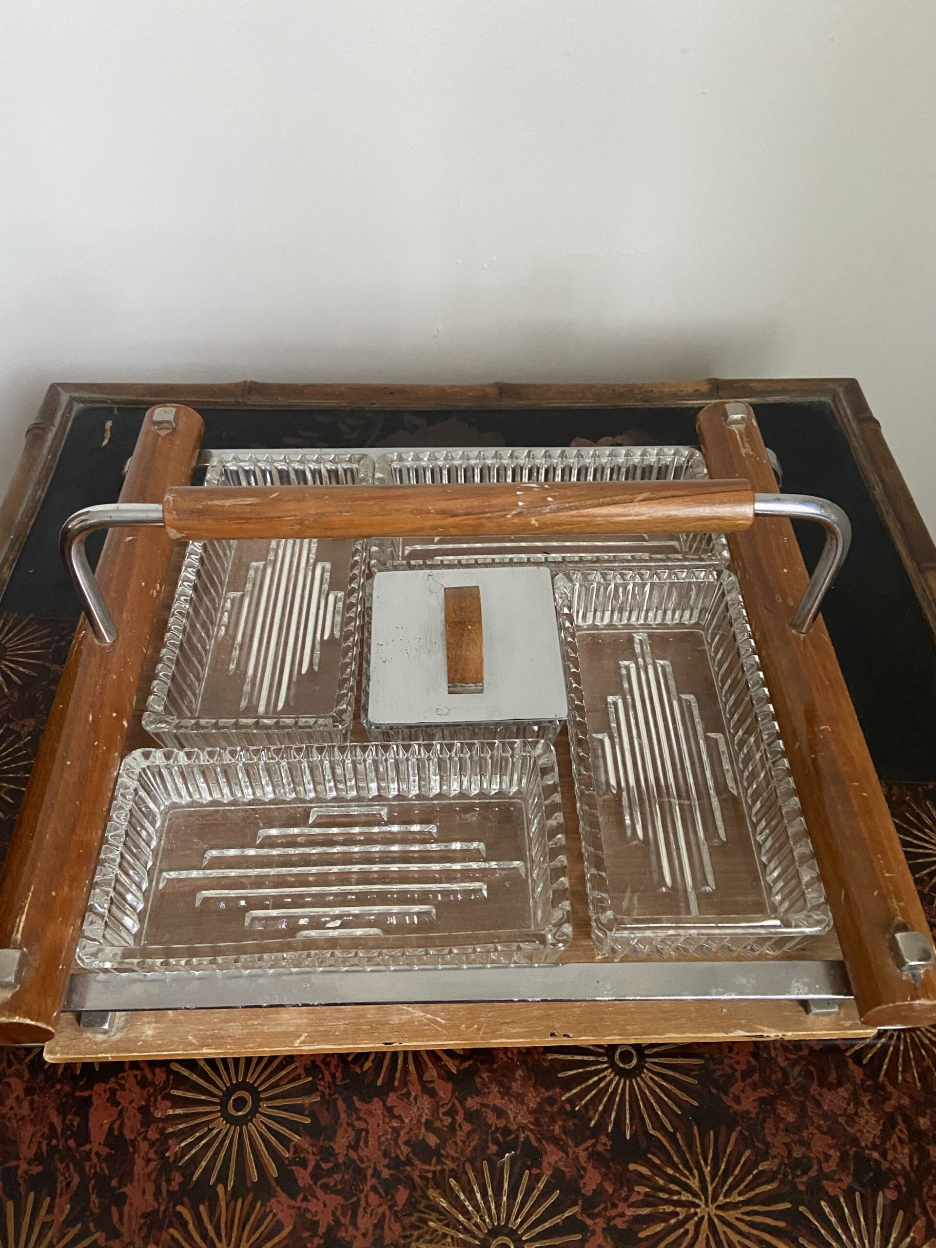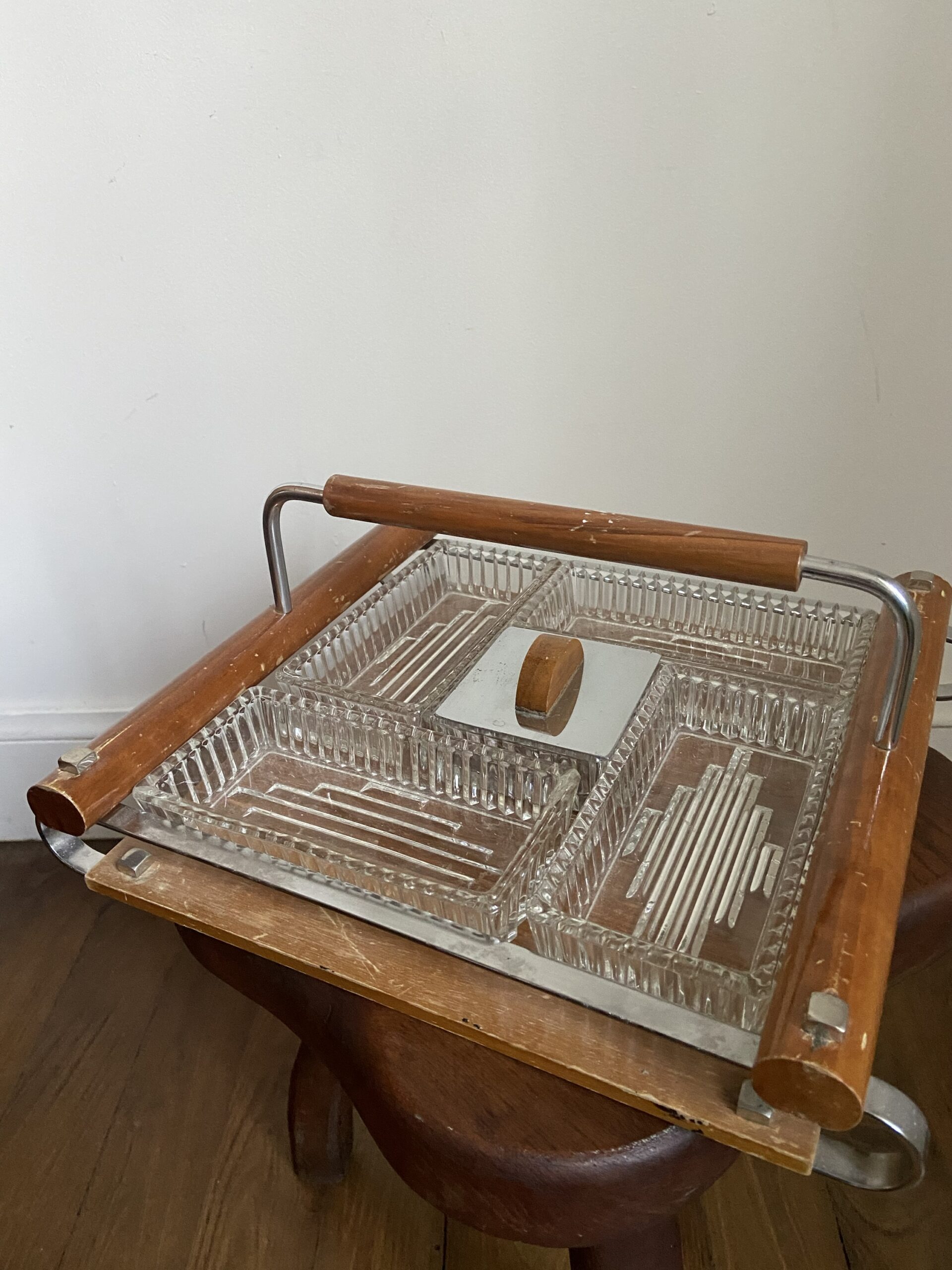 Ancien serviteur de table à compartiments ou plateau apéritif Art Deco. En bois, verre et metal chromé.