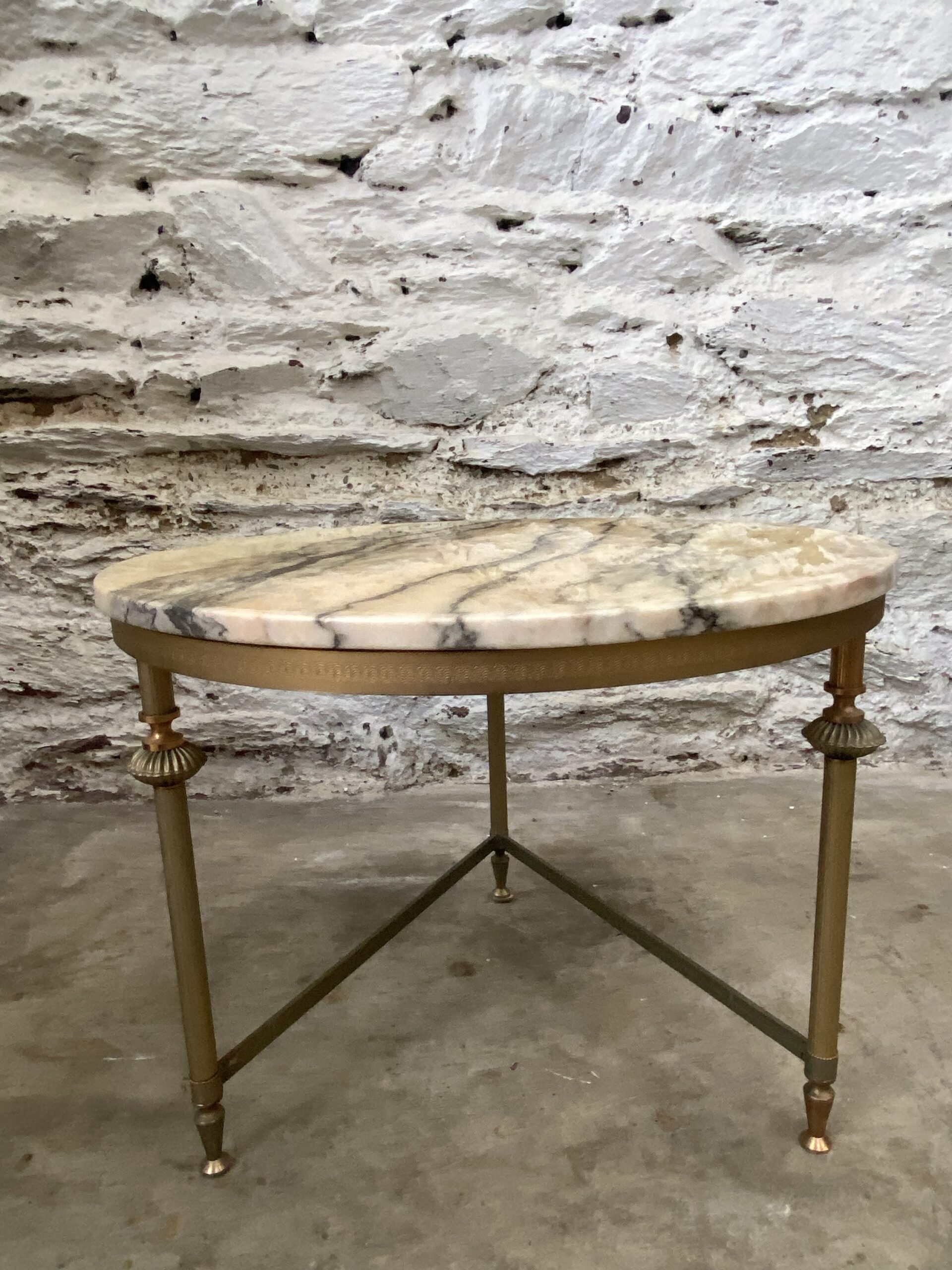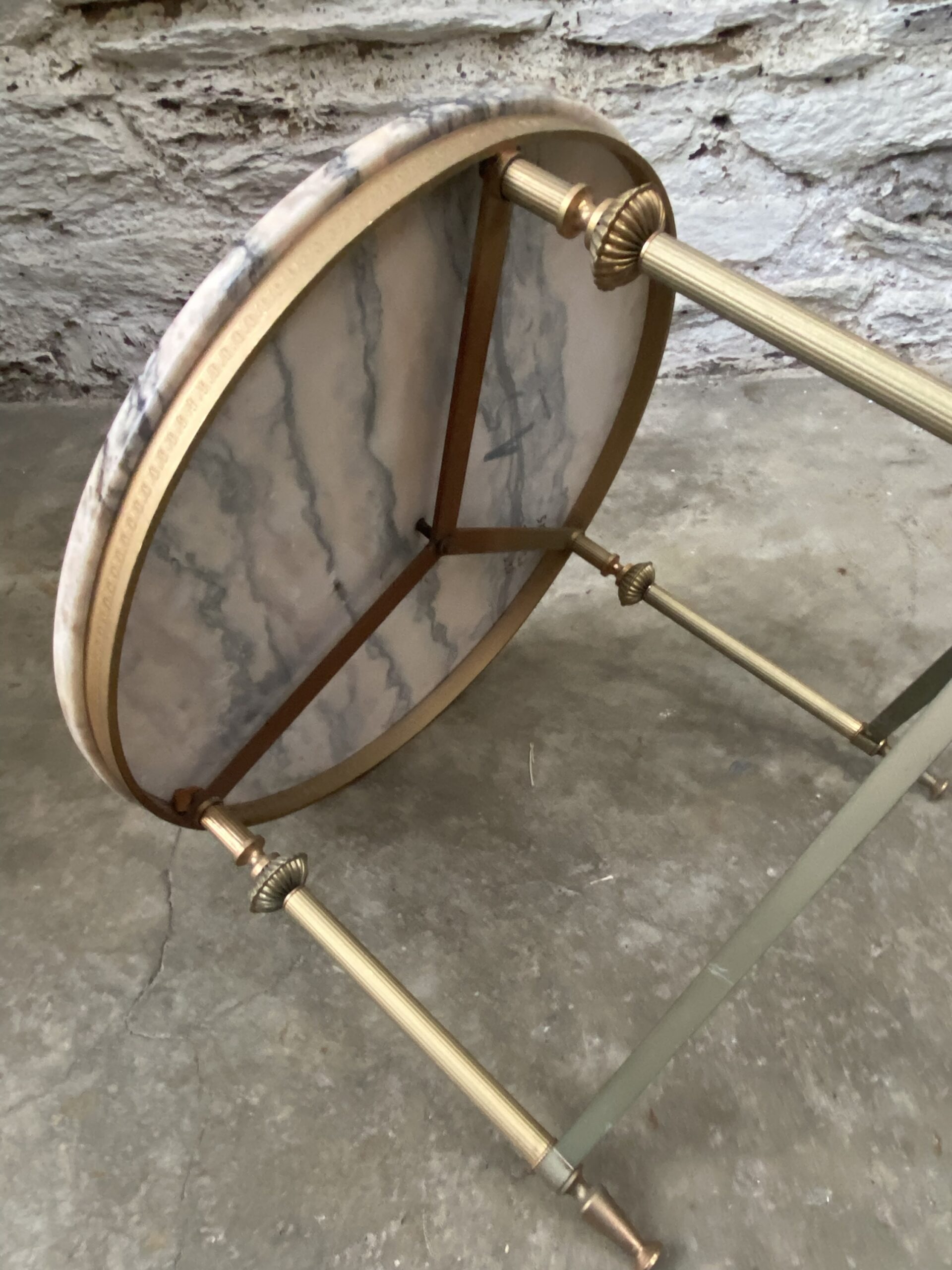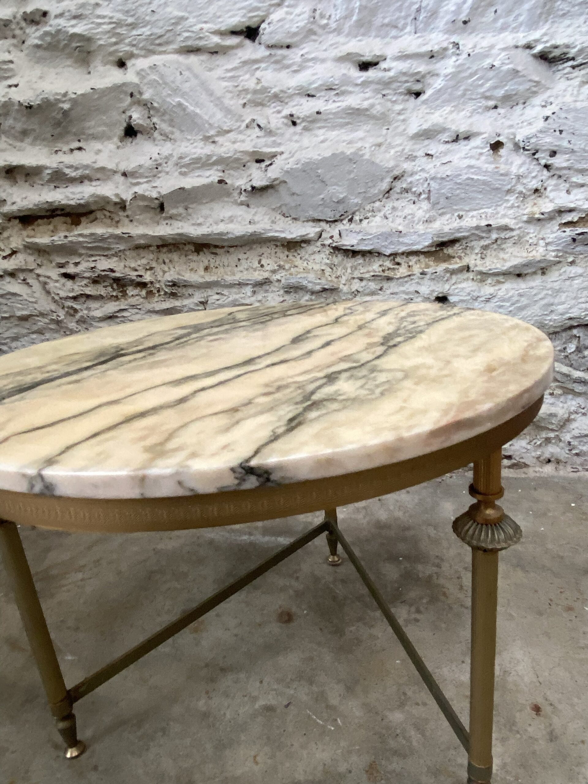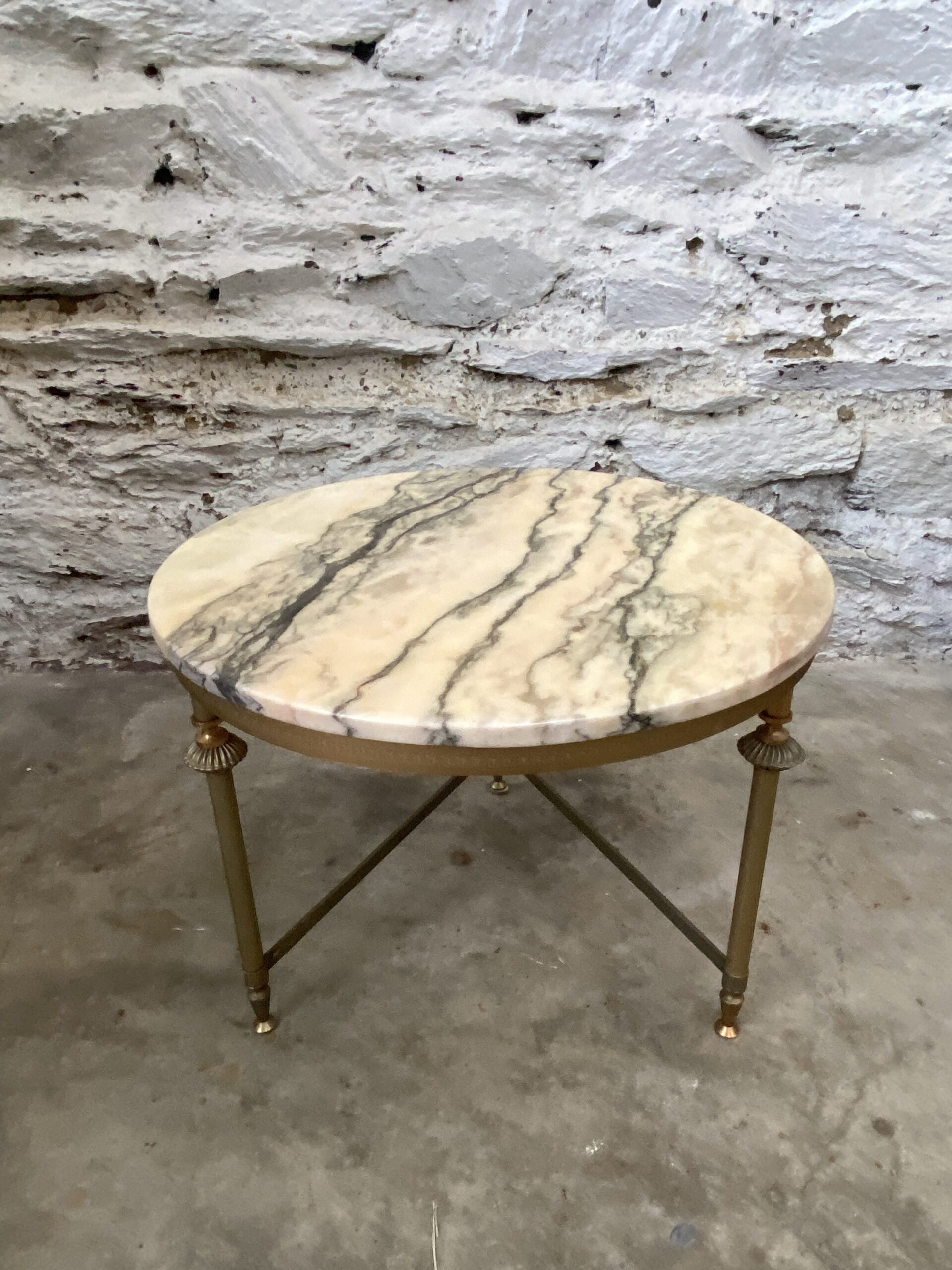 Petite table basse ronde vintage. Piétement en métal doré et plateau en marbre. Style Louis XVI. Années 60. Devait faire partie d’un ensemble de 3 tables gigognes.