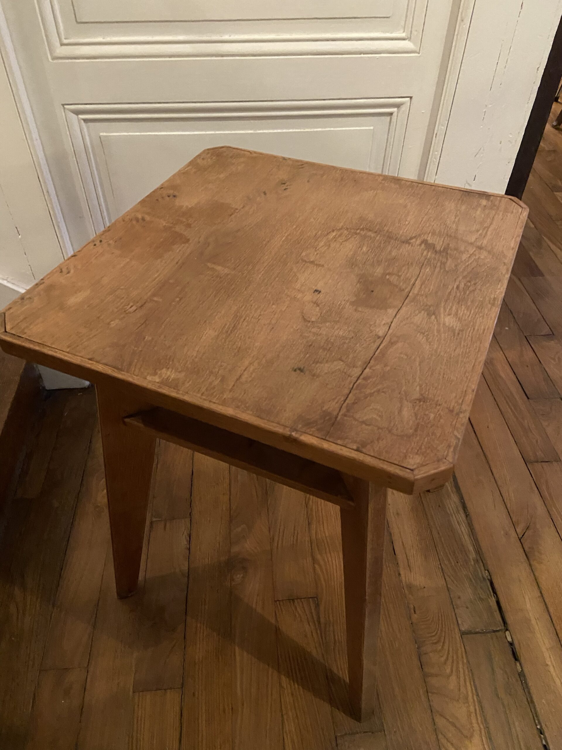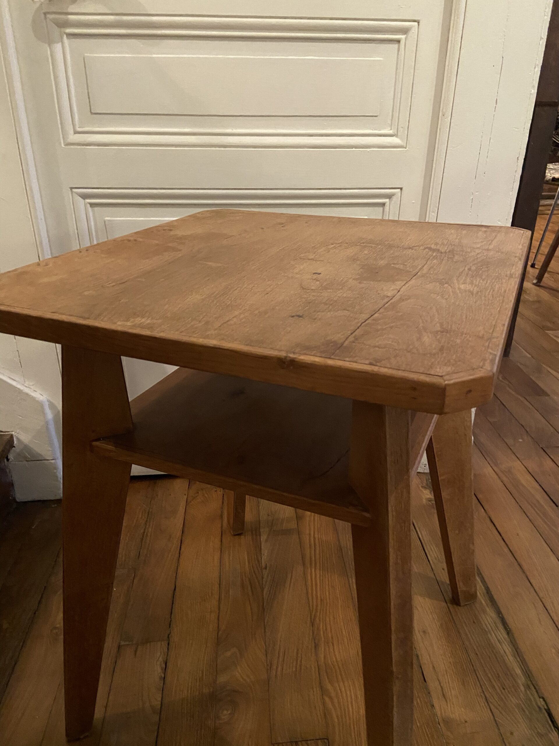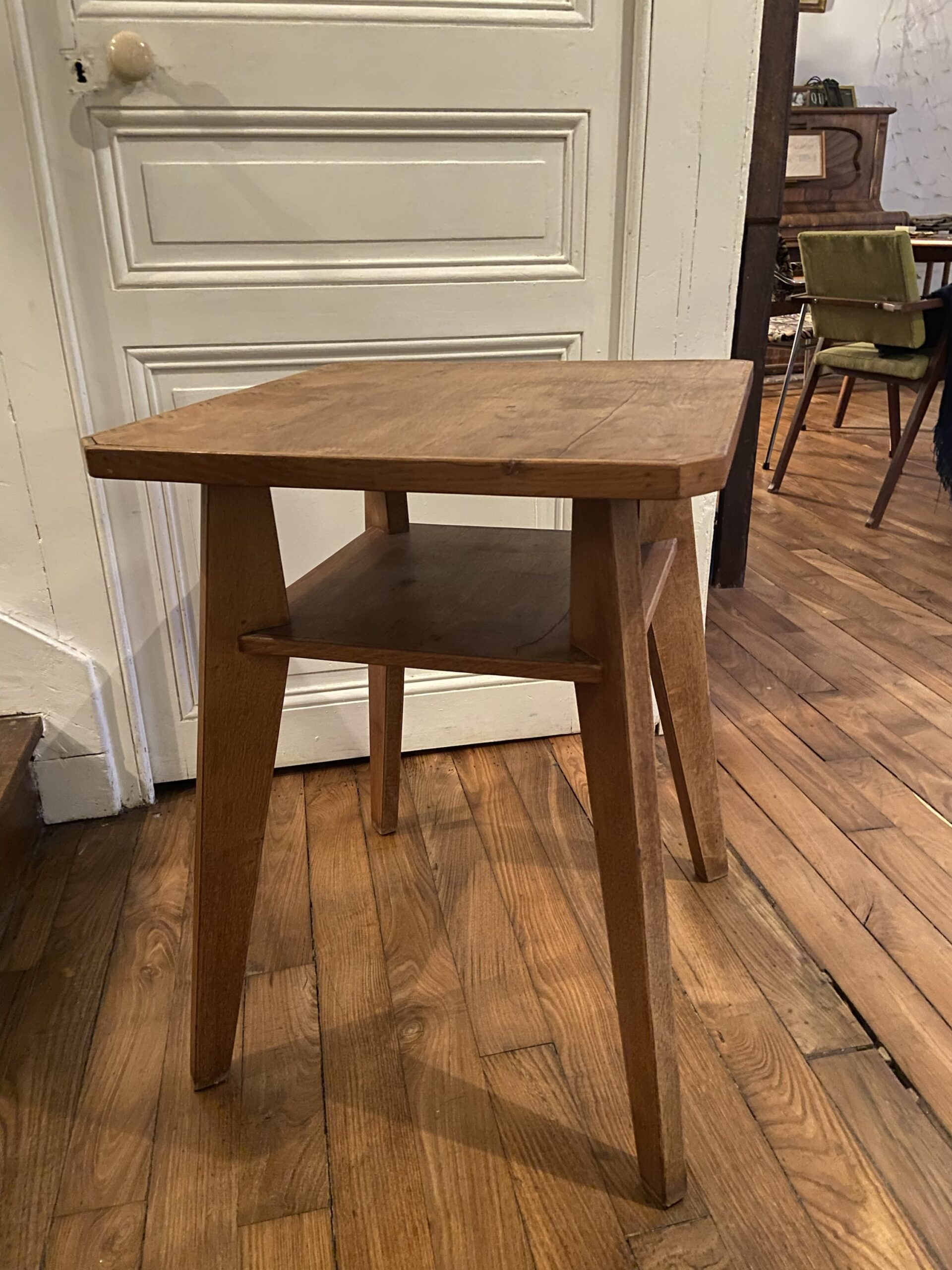 Table d’appoint vintage en bois clair. Pieds compas. Deux plateaux. Années 50.